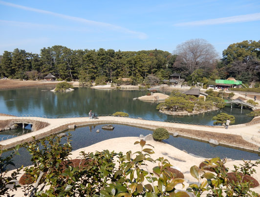 Koraku-en signifie "le jardin de la puissance retardée". Ce jardin de promenade est situé près d'Ujo (château aux corbeaux) à Okayama. Avec les jardins de Kenroku-en et Kairaku-en, il s'agit d'un des plus beaux jardins du pays. Le Koraku-en met en scène des collines, des arbres, des étangs, des ruisseaux, des maisons de thé et un théâtre Nô. Il était utilisé pour accueillir et divertir les invités importants, et fut un lieu de retraite pour le daimyo (puissants dirigeants féodaux). Il a subi plusieurs dommages du fait des innondations et des bombardements, et sa restauration a été effectuée en 1952, basée sur des peintures et des croquis datant de la période Edo.