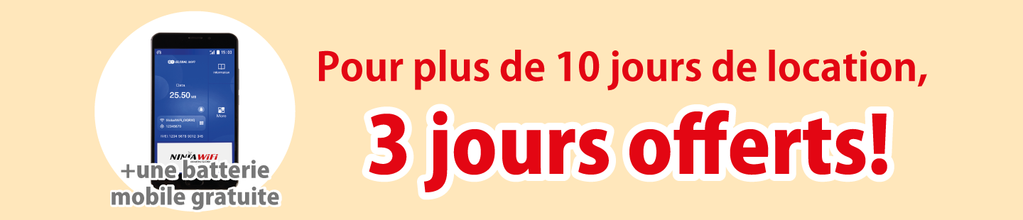 Réservation pour plus de 10 jours de location, 3 jours offerts ! + une batterie mobile gratuite.